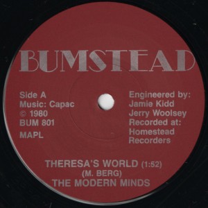 A few notorious and sought-after singles were released on Bumstead out of Edmonton in the years 1980-1982. Rock and Roll Bitches, The Modern Minds, and K.D. Lang’s first single. The rumor is that the label owner had a deal where bands paid a flat-rate and got a recording and a 7″. Most 7″s put out by Bumstead came in over-sized 7″ sleeves.